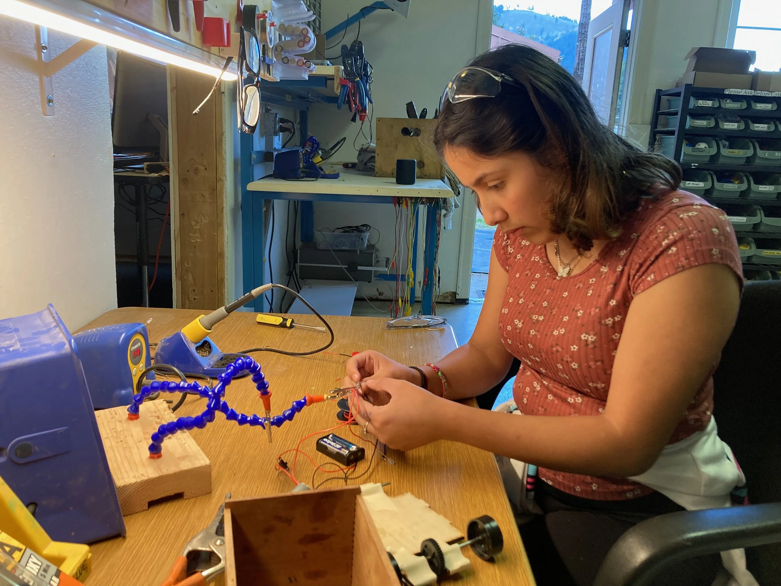 Learn hands-on skills back at the shop like programing microcontrollers, soldering, working with electronics, drawing in CAD programs, and using 3D printers.