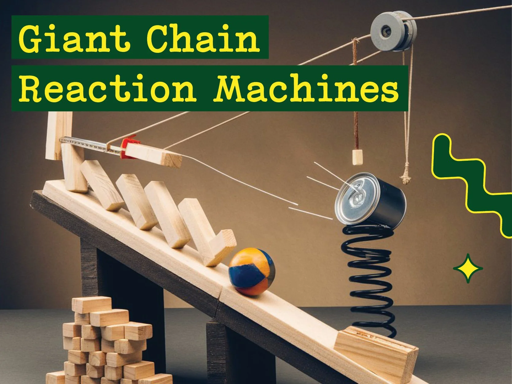 Remember the board game Mousetrap? Have you ever built a Rube Goldberg Machine as a school assignment? We’re gong to take those ideas to a GIGANTIC scale. Imagine bowling balls, bicycles, trap doors, and yes, giant dominos!