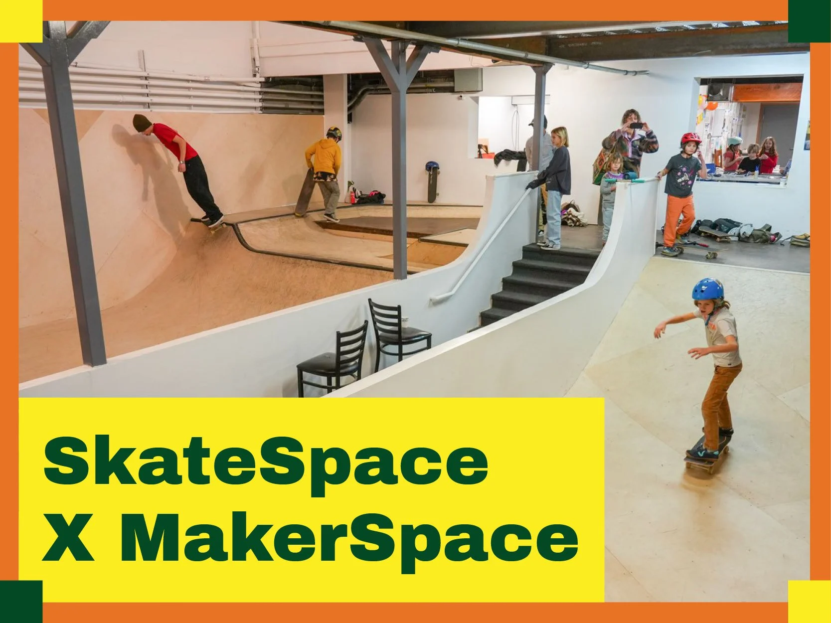 SkateSpace X MakerSpace collab camp! Spend each morning skating at SkateSpace and other local skate spots. Then after lunch, we’ll spend the afternoon crafting some skate-related items at the MakerSpace. By Friday we’ll be able to test out whatever quarter-pipe, manual pad, or skate rail we make. Along the way we’ll also have a fingerboard press where kids will learn to glue up the plys and shape their board once the glue has set.